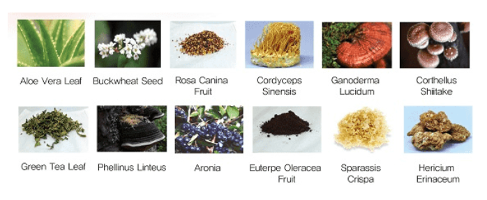 Chiết xuất lá lô hội, chiết xuất hạt kiều mạch, callus edelvase, dipropylene glycol, levan, nicotinoyl, ethanol, axit ascorbic, arbutin, diethoxyethane monostearate, Pantipeptide-19, tocopherol, ethyl ascorbyl ether, beta-glucan, panthenol, sodium hyaluronate, hydroxy cinnamic acid, chiết xuất đậu xanh, arginine, glycine, caffeine, allantoin, chiết xuất nấm trắng, Carnitine , Dầu thầu dầu hydro hóa Pigi-60, crosspolyme-6 Polyacryit, chiết xuất rễ cây hogweed đỏ, chiết xuất từ cây cọ Asai, Hexanediol, chiết xuất nấm shiitake,..
